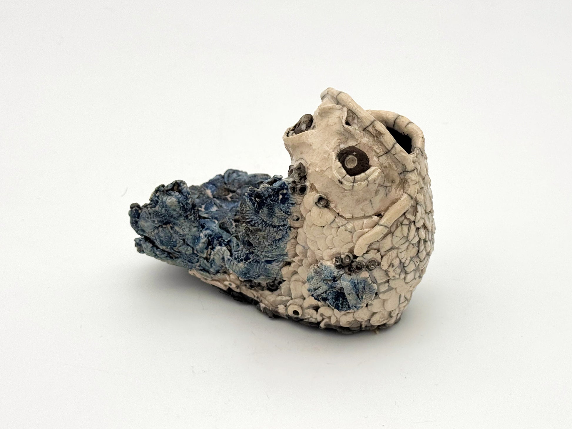 Raku Fish — White Crackle & Blue Barnacle (Large)